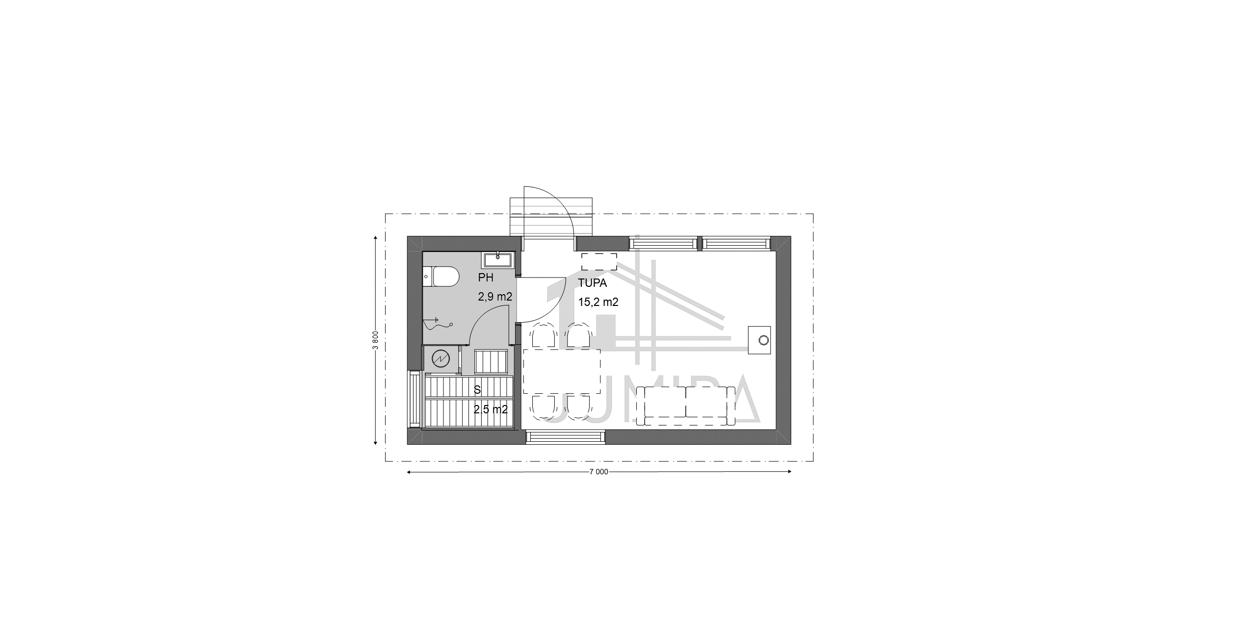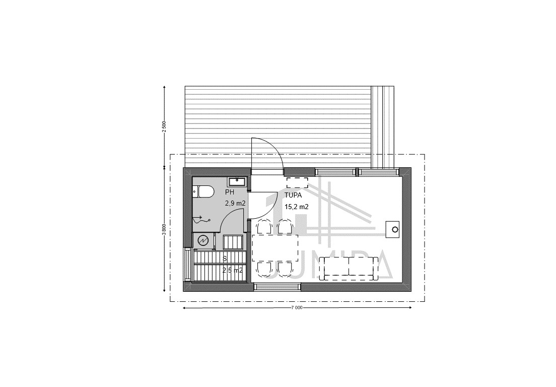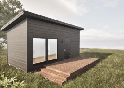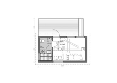 Tämän minitalon avulla saadaan helposti lisätilaa pieneksi jääneeseen asuinrakennukseen. Minitalo on myös hyvä lisä mökkitontille. Rakennuslupaa ei tarvita, sillä kerrosala jää alle 30 m². Kokonaisuuden voi valita isommalla tai pienemmällä terassilla riippuen tontista ja minitalon käyttötarkoituksesta.