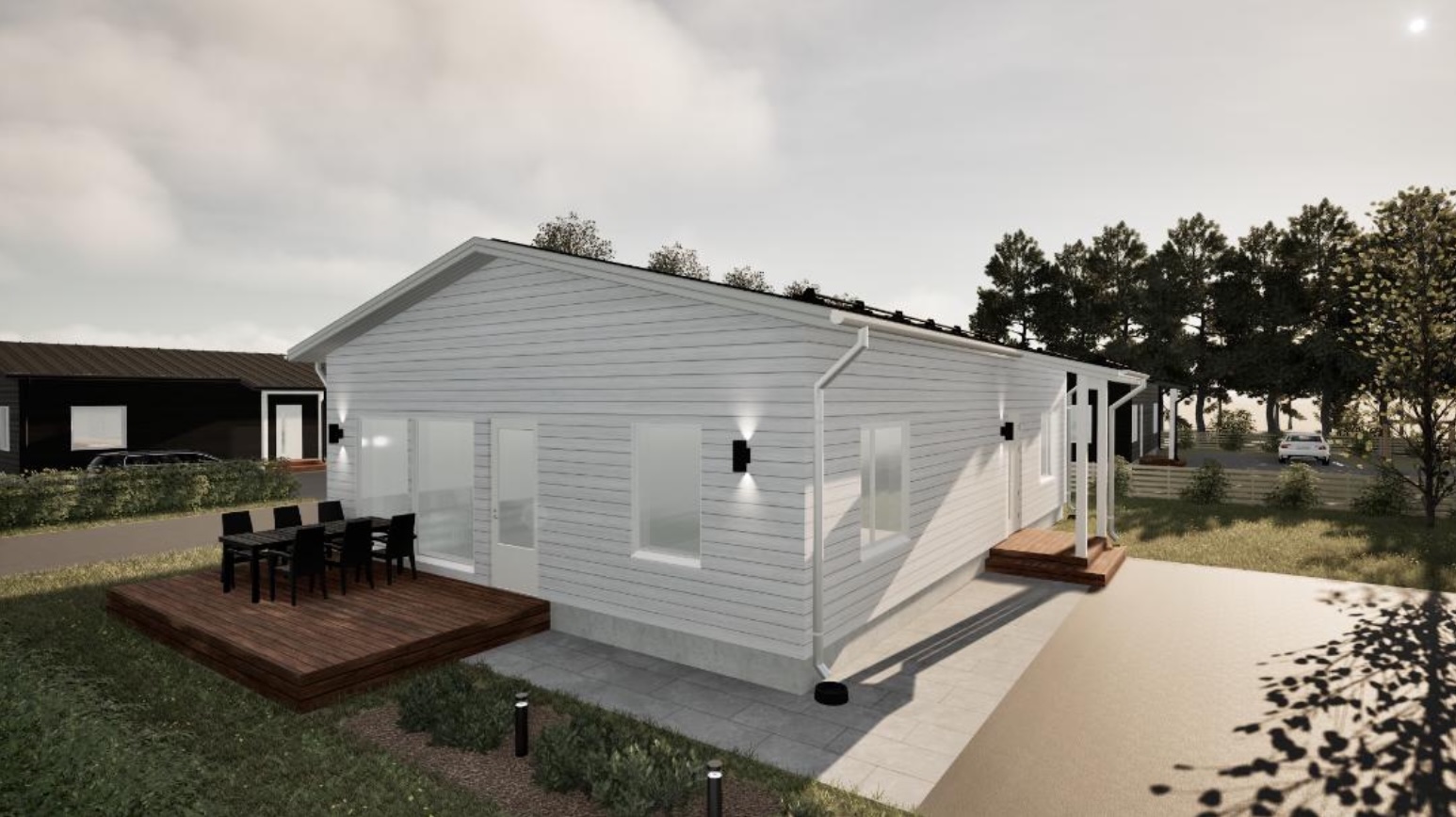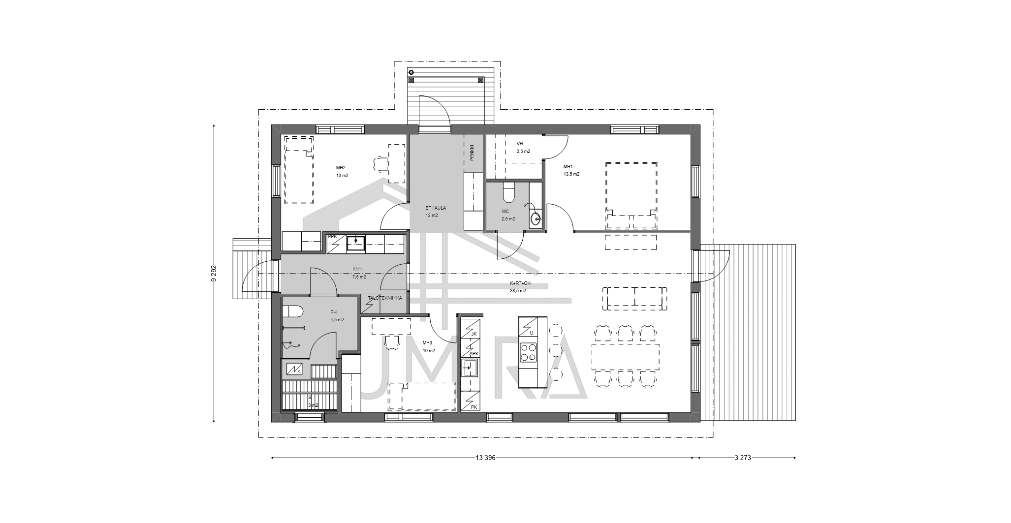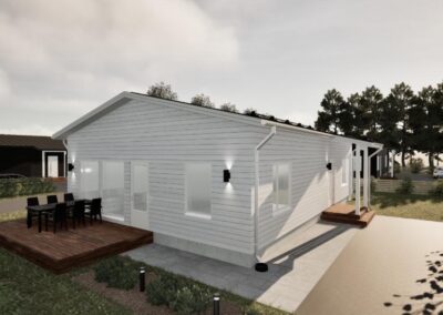 Pesuhuoneeseen voidaan lisätä toinen suihku tai pesuallas asukkaiden tarpeiden mukaan ja pohjaratkaisua voidaan muutoin muokata yhdessä suunnittelijoidemme kanssa. Kodinhoitohuoneeseen liitetty sivuterassi mahdollistaa vaivattoman pääsyn ulos vilvoittelemaan saunan jälkeen.