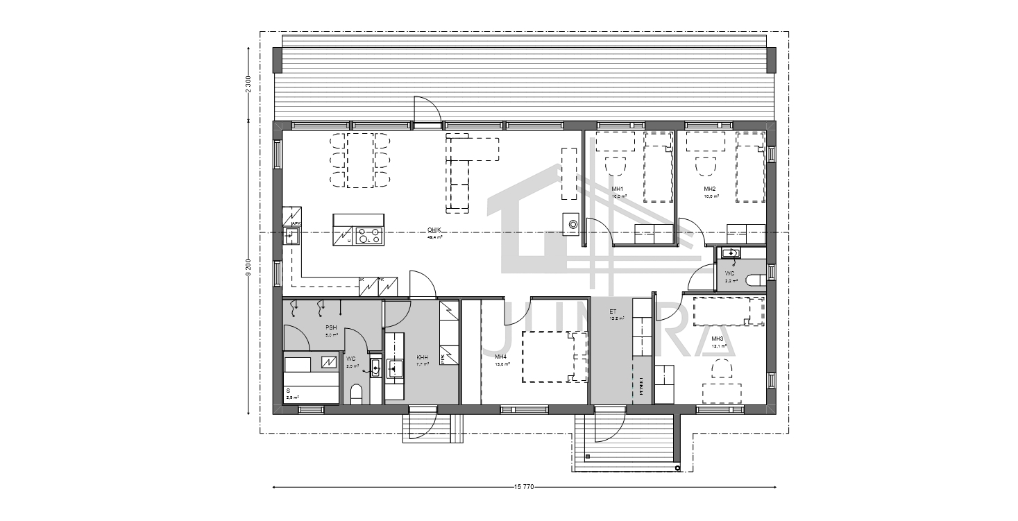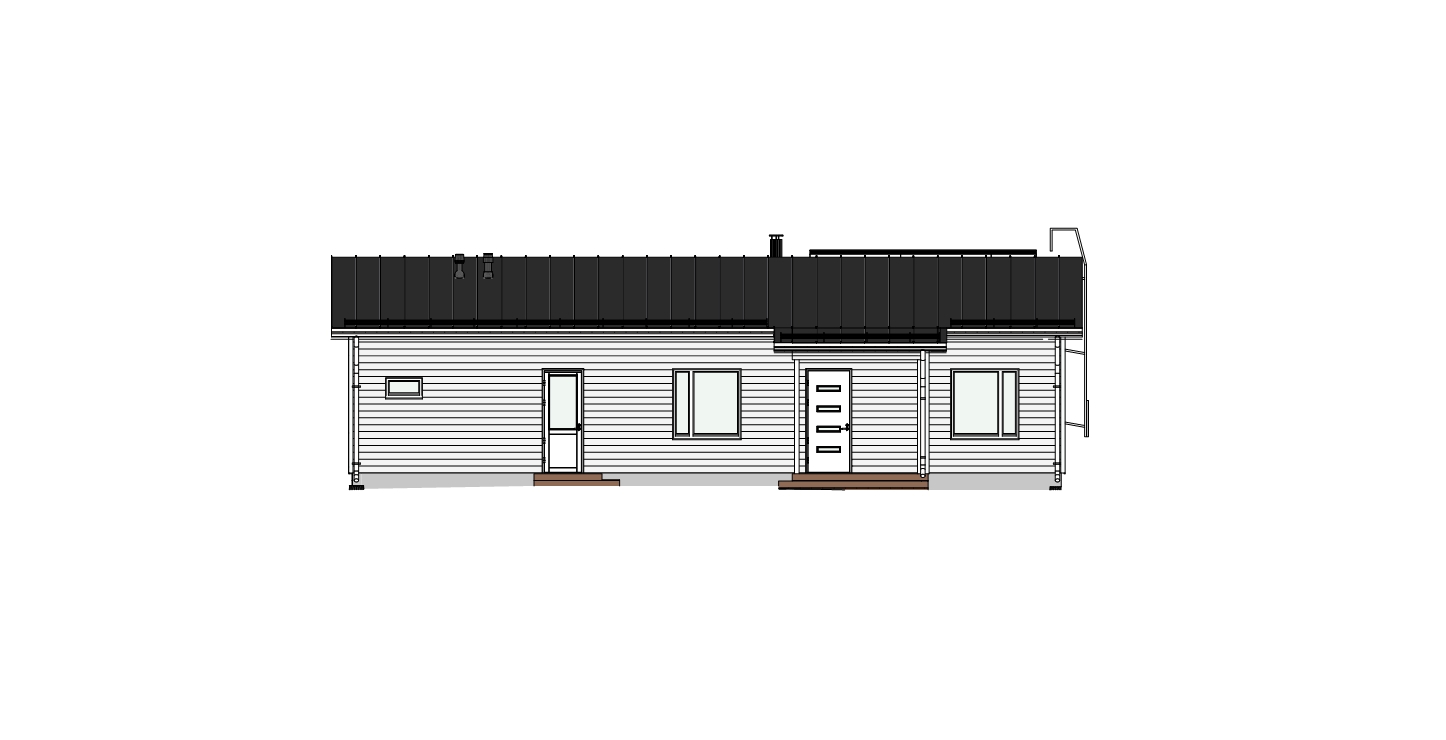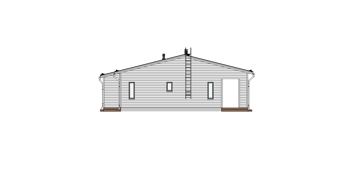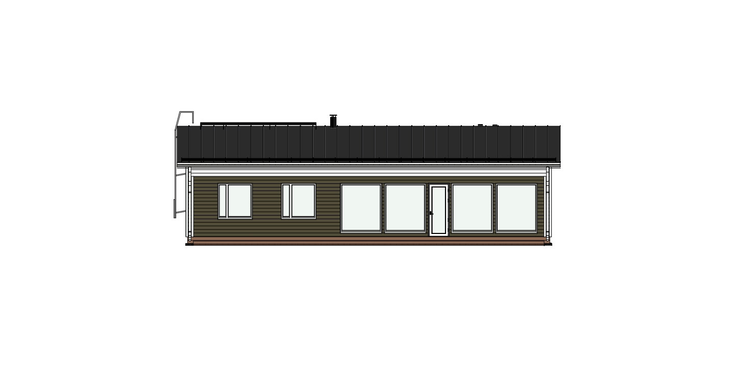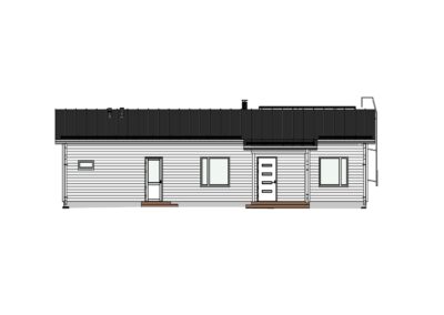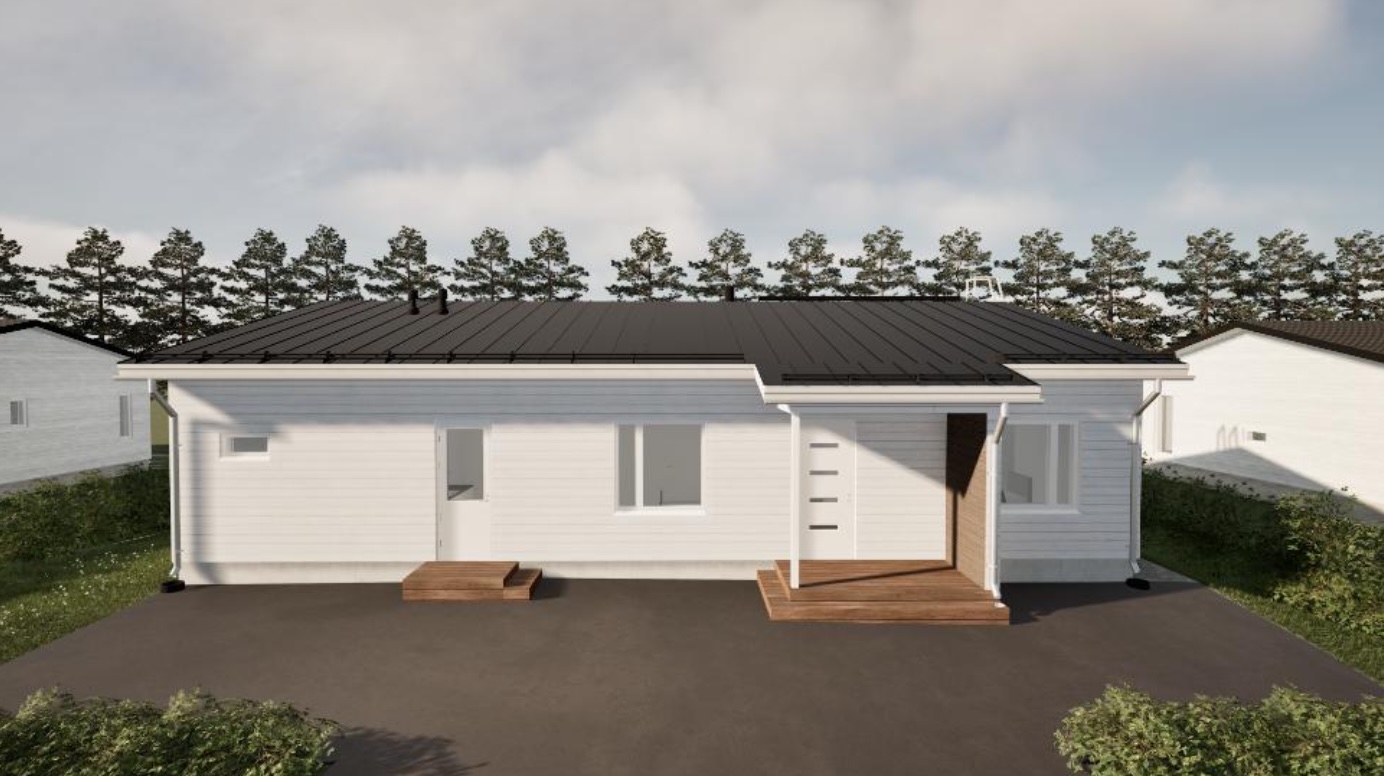 Takapihalle avautuu suuri terassitila isojen ikkunoiden saattelemana, jotka tuovat olohuoneeseen ja keittiöön runsaasti luonnonvaloa. Terassi on modernin linjakas ja sen voi helposti lasittaa jälkikäteen.