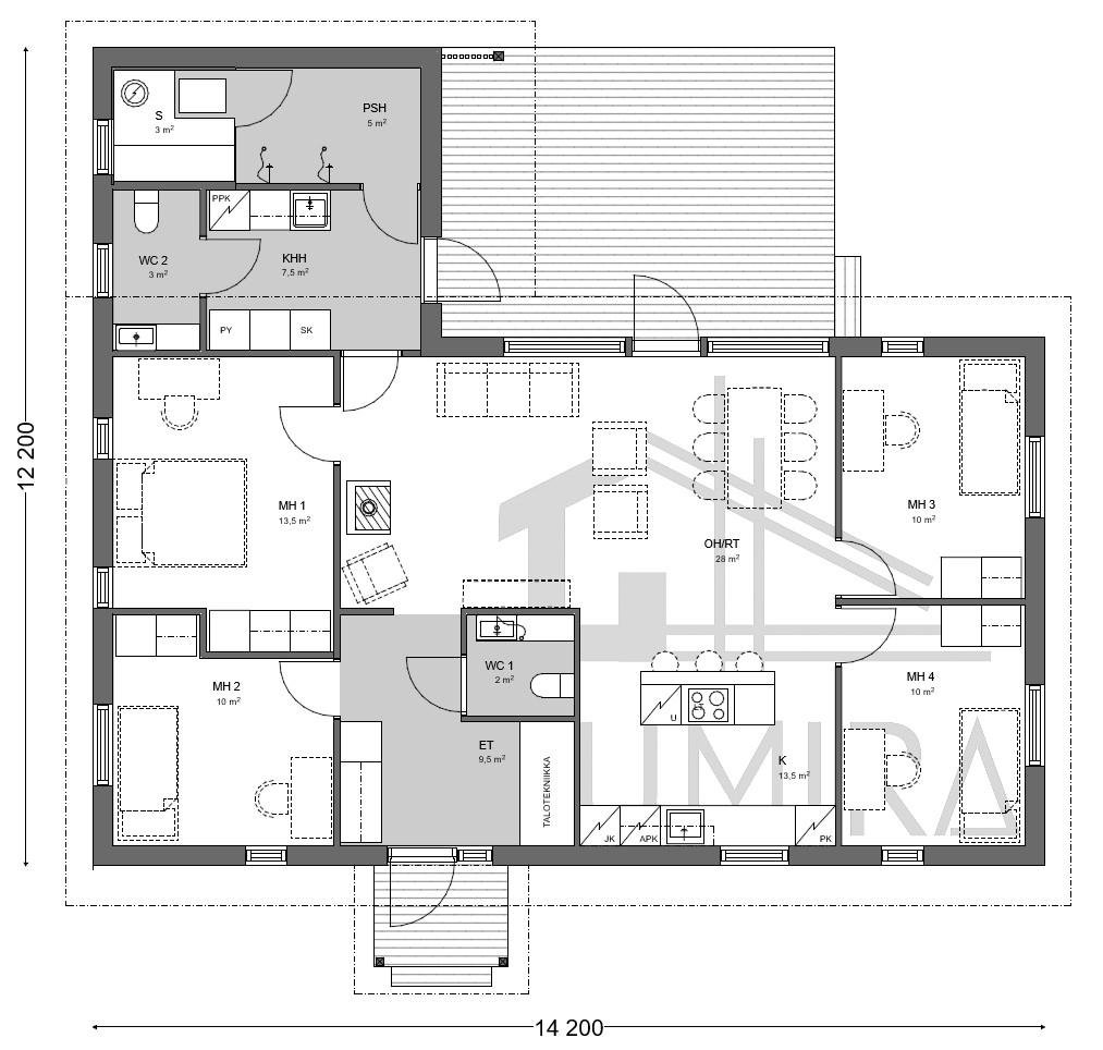 Makuuhuoneita on tässä asunnossa neljä: kolme pienempää makuuhuonetta sekä hulppean kokoinen päämakuuhuone. Huoneen sijainti pesutilojen vieressä tekee pyykkihuollosta sujuvaa ja arjesta toimivaa. Pesutilojen sijainti omassa siivessään tarjoaa suojaa terassille, jossa on loistavat puitteet vilvoitteluun ja oleskeluun.