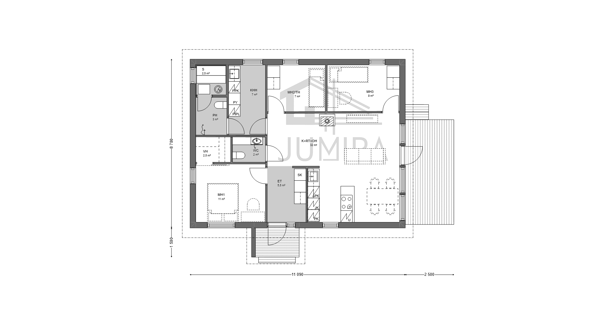 Keittiön kaappien sijoittelu rajaa ruokailulle viihtyisän tilan valoisalle paikalle, jättäen samalla runsaasti tilaa olohuoneen kalusteille. Kesäaikaan ruokailutilaa voidaan jatkaa keittiön eteen avautuvalle tilavalle terassille.