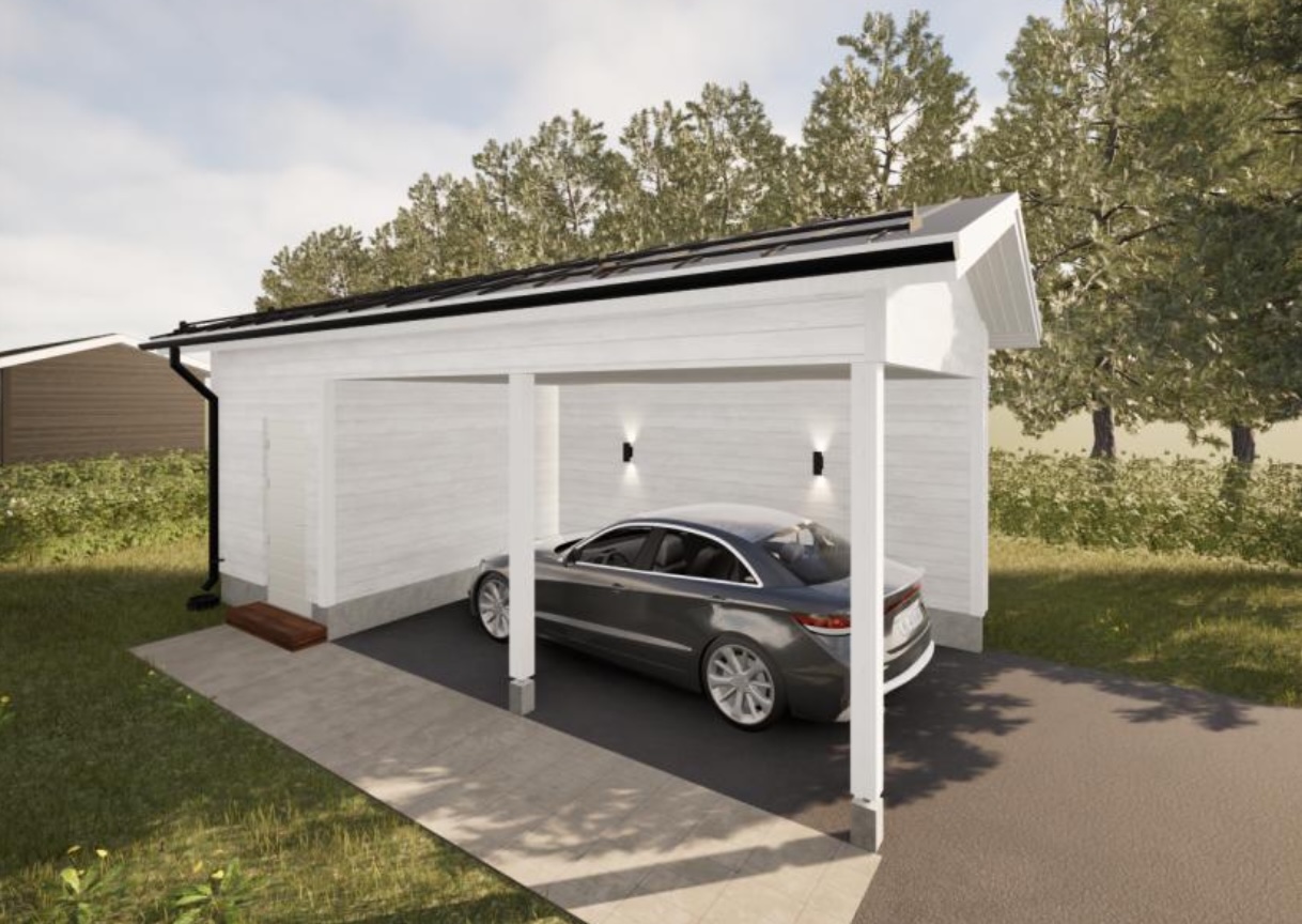 Tämä autokatos yhdellä autopaikalla ja varastolla on hyvä lisä talopakettiisi. Yksinkertaisen katoksen yhteensovittaminen asuinrakennukseen onnistuu vaivattomasti julkisivuvärivalinnoilla. Autokatoksen voi ostaa myös erillisenä kokonaisuutena.